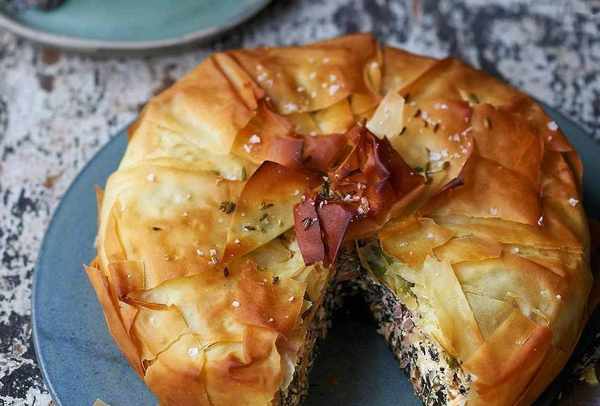 【做法】1、預熱烤箱到190度。力可達芝士倒入濾網瀝掉乳清。徹底沖幹凈唐萵苣,放在幹凈的茶巾上瀝幹,細細切絲。2、鍋中倒橄欖油,中火熱鍋,倒入青蒜、洋蔥、大蒜、尖椒、鹽漬檸檬、孜然、茴香籽和一大撮鹽炒到青蒜和洋蔥變軟、發出香味。3、倒入唐萵苣、香草,再擠上檸檬汁,加適量鹽和胡椒粉再翻炒幾分鐘,炒到葉子萎瞭但還沒有成泥就離火放涼,然後將唐萵苣放在濾網上使勁擠掉所有的水分。4、雞蛋攪打到發泡,倒入力可達芝士和菲達芝士,再倒入綠葉菜混合物攪拌到完全混合均勻,對著磨上肉豆蔻粉。5、往一個20cmX9cm的深蛋糕模具裡刷上一點芥花油,鋪進一張酥皮,用手指仔細鋪平,不要留下縫隙。底部和側面要完全覆蓋,邊緣還要多留出一截。在酥皮上多刷點油。再鋪上一層,確保底部完全蓋住。就這麼重復,一層一層的鋪,每層之間刷足量油。隨時註意調整一下,確保覆蓋均勻。直到模具徹底包好。6、往模具裡填上芝士和綠葉菜混合物,用酥皮蓋好,每層之間以及頂上刷上油、撒上香草。中間弄皺幾張酥皮,讓它的口感更豐富。頂上多撒點茴香籽。7、烤50分鐘,到變成金色、內餡定型後就出爐,靜置定型至少20分鐘,然後脫模徹底放涼。