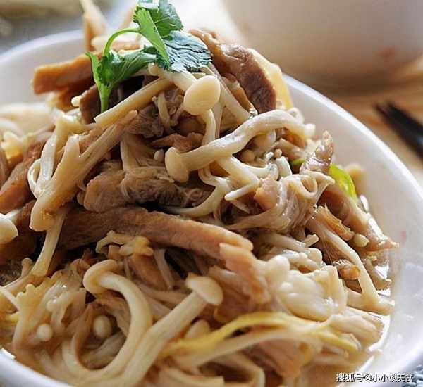 材料:金針菇、豬肉碎、鹽半茶匙、醬油2茶匙、雞湯半茶匙、洋蔥適量、薑適量、料酒1茶匙、醬油適量醬油、水、淀粉、植物油適量、糖少許