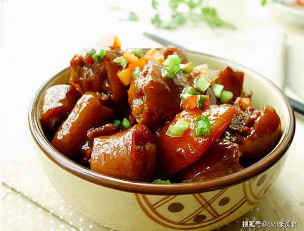 3、加入大量鮮醬油,加水沒過豬尾,大火煮熟,中火蒸10分鐘,瀝幹,倒入砂鍋收汁,放入蒜青。烹飪前。