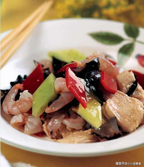 配料:水油海參100克,蝦仁100克,水煮雞100克,紅辣椒1個,黃辣椒1個,香油6克,醬油6克,香醋3克,香醋3克香醋1.5克,精鹽1.5克,味精1.5克。