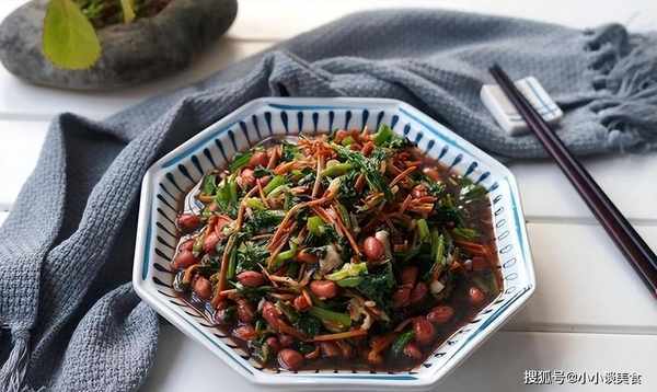 配料:菠菜100克,花生米70克,金針菇60克,大蒜15克,香菜2片,醋適量,鹽適量,香油少許