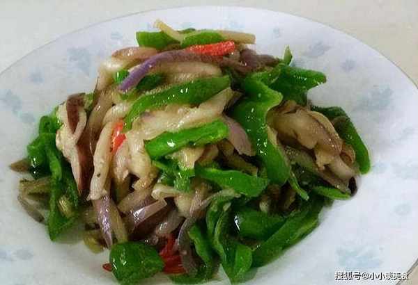 2.香菇切薄片,薑切片,青紅椒切小塊。熱鍋油燒熱,將醃制好的肉片放入鍋中炸至變色,然後加入油將薑片炒香。