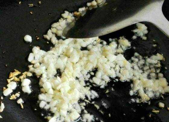 第六步:鍋裡放油,燒熱。油燒熱後,加入蒜末,用文火煮香,然後將混合好的汁倒入碗中。