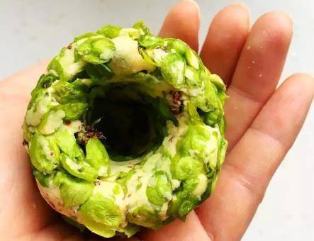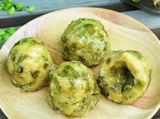 第四步:再取適量的榆錢、面粉和玉米面,放在掌心,做成蒸好的丸子狀。