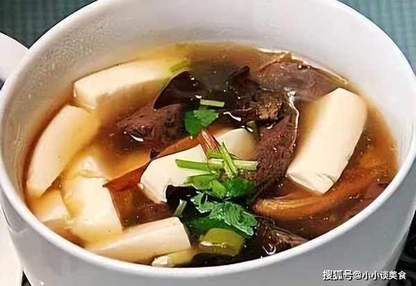 原料:鴨血150克、豆腐100克、泡好的香菇、黃花菜、蔥、薑、鹽、醬油15毫升、香醋15毫升、雞水、花椒、香菜。