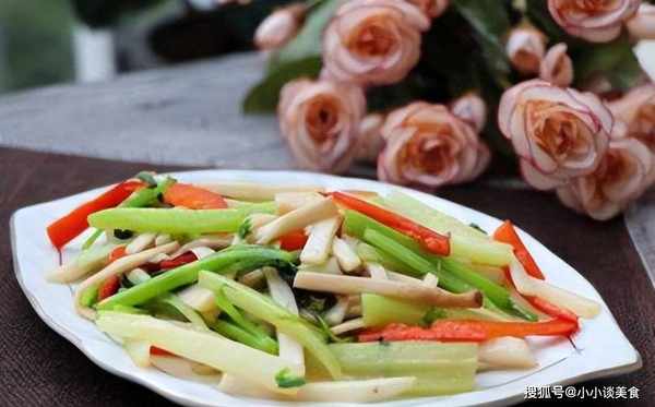 3、起一鍋油,放入一些蔥,放入胡蘿卜翻炒片刻。4.然後加入芹菜和杏鮑菇炒至胡蘿卜和杏鮑菇變軟。