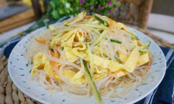 材料:粉絲1條、雞蛋1個、黃瓜1條、胡蘿卜1根、生抽3勺、醋2勺、白糖1勺、香油