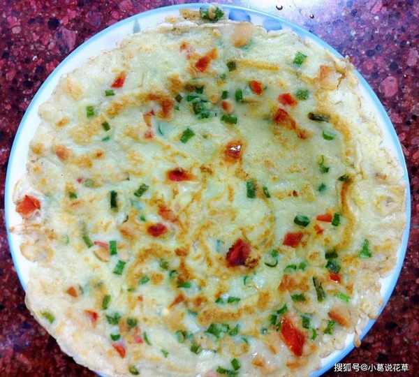 2.平底鍋燒熱油倒入調好的面團,將面團搟成圓形,待凝固後將平底鍋翻過來(煎的過程中用勺子不斷翻動整個蛋糕,把火調大轉中小火避免油炸,將油勺放在蛋糕上輕輕翻炒)翻炒3分鐘左右(翻炒的時候能感覺到水幹透輕)