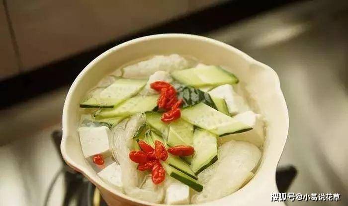 7、加入黃瓜片和枸杞再煮兩三分鐘,加少許鹽提味。