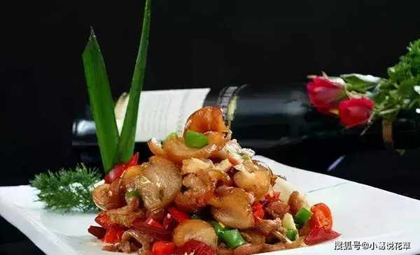 3、鍋內放色拉油燒熱,加入燈籠椒圈和小米椒炒香,再加入豬皮炒香,蠔油同汁,加入辣鮮露。、雞粉、味精調味,出鍋瀝幹,隻加香油。