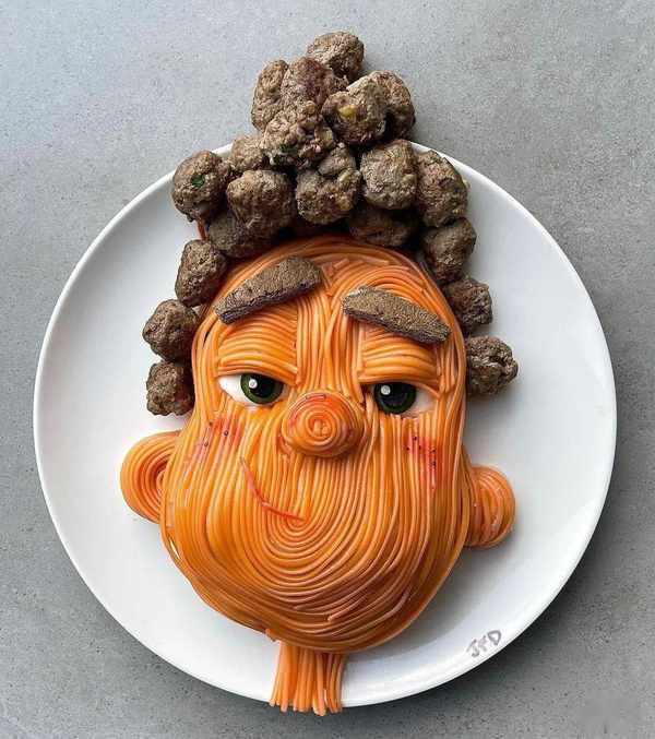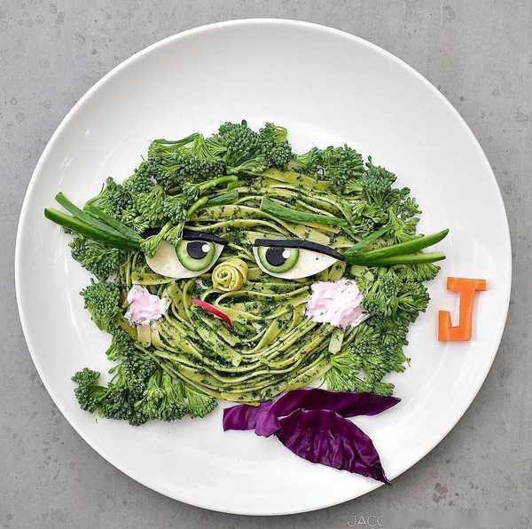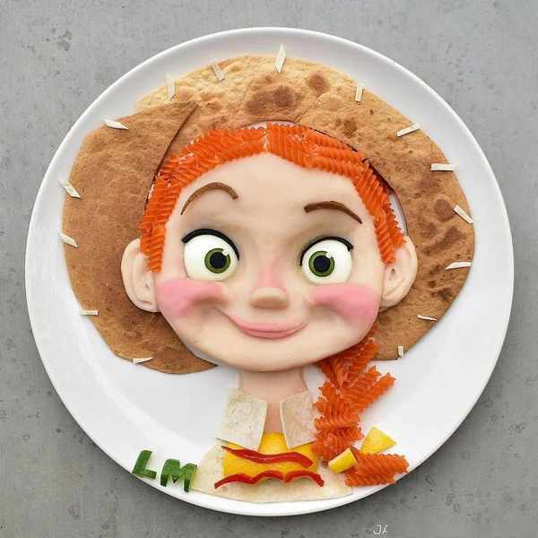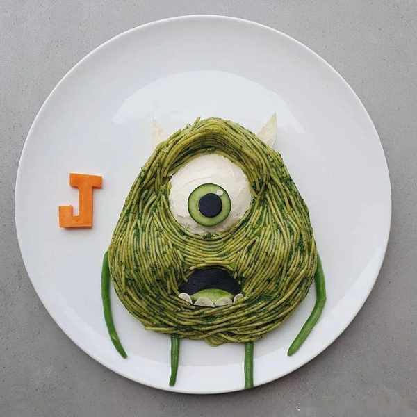 女兒喜歡迪士尼公主,她就把意面、紫甘藍、黃瓜、土豆泥擺成長發公主的樣子。