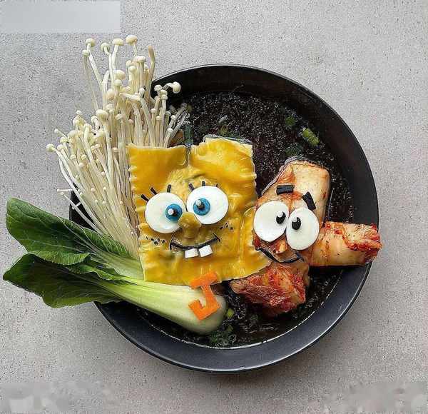 把金針菇、泡菜、豆腐湯擺成海綿寶寶和派大星。