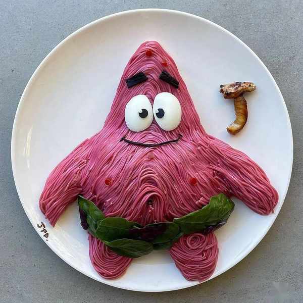 兒子愛看《海綿寶寶》,她就用甜菜汁泡蕎麥面,做成派大星。