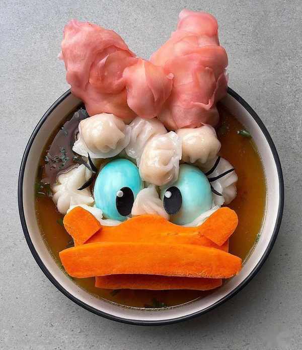 她用蝦餃、雞蛋、嫩薑、胡蘿卜做成黛西鴨。