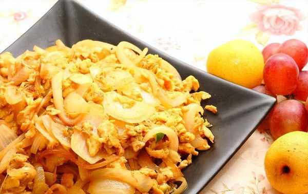 材料:雞蛋3個、洋蔥400克、生抽10克、雞精2克、蠔油10克、鹽2克、花生油40克、香油5克