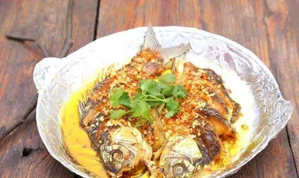 3、鍋內油燒熱至50%,將鯽魚洗凈,下油鍋炸至金黃。