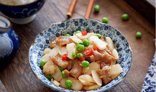 食材:馬蹄、豬裡脊肉、豌豆(熟)、小米椒、鹽、料酒、生抽、淀粉