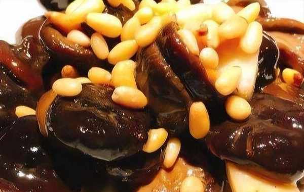 配料:松子50克,香菇500克,蔥薑油100克,雞油5克,鹽和味精4克,白糖25克,濕淀粉15克,糖色少許,雞湯250克。