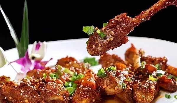 3、鍋留底油,將炸好的寸金骨放入鍋中,加入海椒面和孜然粉翻炒均勻,出鍋前撒上少許蔥花淋入花椒油和香油,裝飾即可服務時一點點服務。