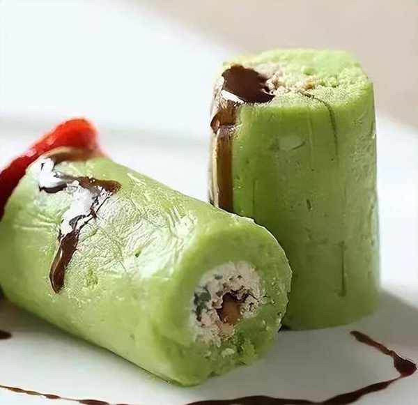 3、保鮮膜上鋪好拌好的泥,包上老豆腐餡,撒上腰果碎,搟成卷,切段,裝盤稍做裝飾。