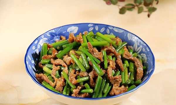 食材:牛肉半斤、蒜苔半斤、鹽4g左右、生抽1勺、油3勺、花椒10粒