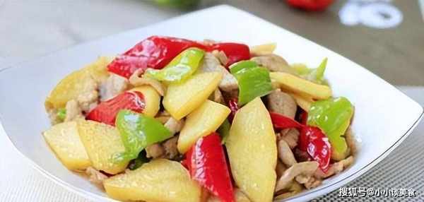 2、土豆洗凈,去皮,切成2毫米厚的菱形片,放入油鍋炸至微黃,撈出瀝油,待油熱後,將剩下的土豆片煎熟。