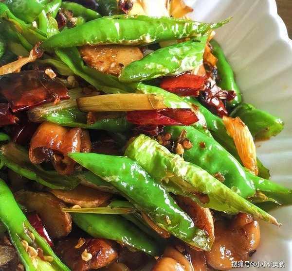 5、鍋內留底油,先放入青椒、小米椒和蒜苗翻炒1分鐘;倒入炸好的豬肝,大火翻炒幾下;關掉暖氣!撒上蒜葉,留溫焯蒜葉至斷,加少許味精裝盤。