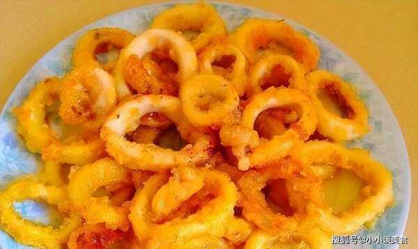 6、鍋中油燒熱,放入魷魚圈炸至金黃即可撈出。