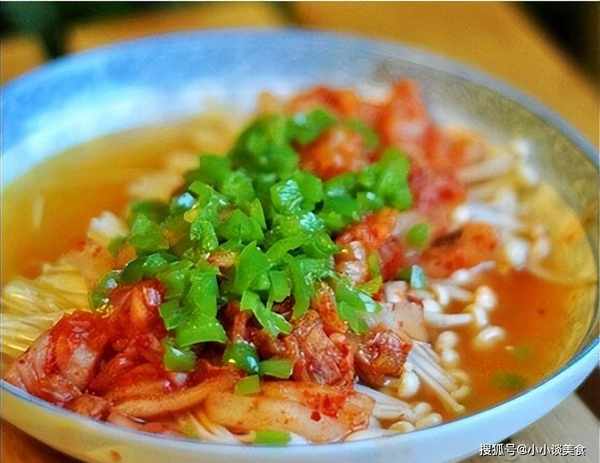 做法1、將金針菇的根部切下,撒好,用清水浸泡片刻,再用流水漂洗幾遍;將洗凈的金針菇瀝幹水分,裝盤;泡菜,切碎;