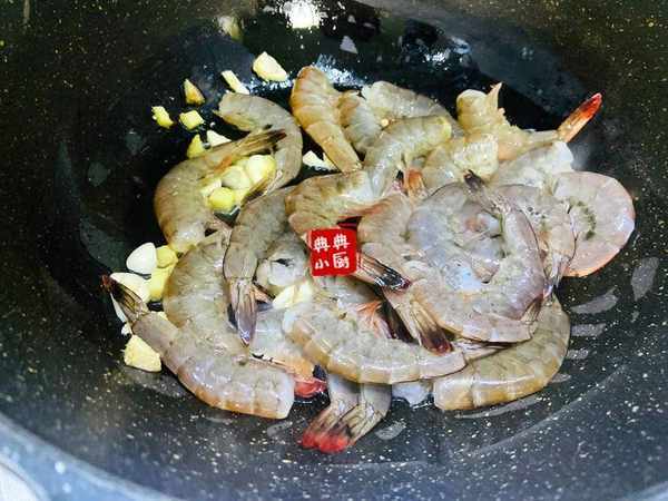 起油鍋爆香薑蒜,把蝦倒進去,加一點料酒,翻炒至變色。
