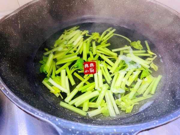 鍋裡水燒開之後把芹菜段放進去焯一下再撈出來。