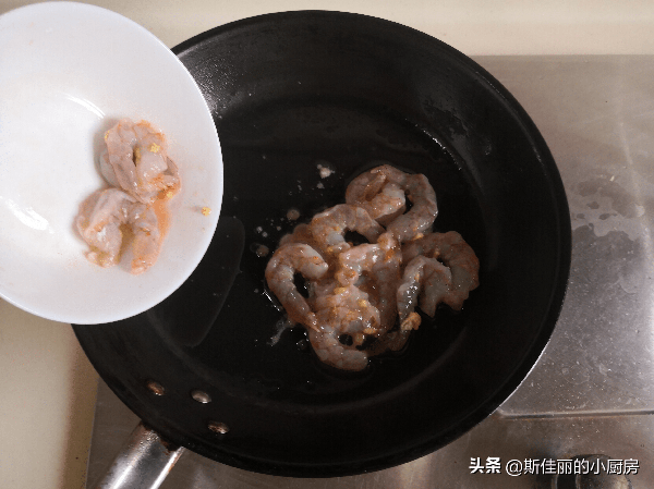 2. 燒熱鍋放入適量的油, 將醃制好的蝦仁放進鍋中翻炒至微微變色;
