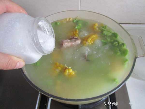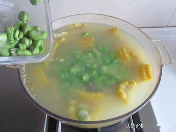 原料: 排骨 玉米 蠶豆米 薑片 胡椒粉 蔥花 油鹽