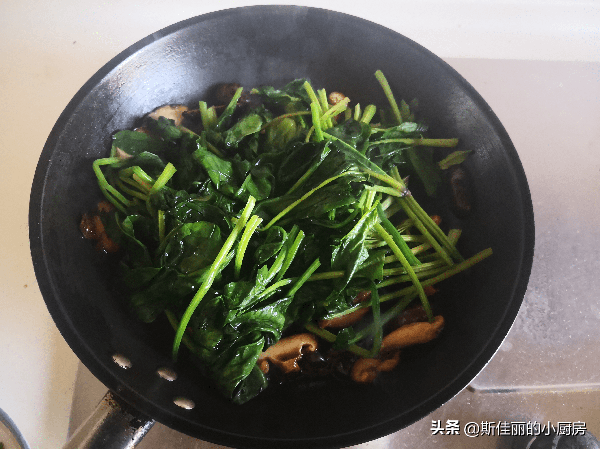 4. 香菇炒至九成熟時, 將焯燙好的菠菜放入鍋中翻炒;