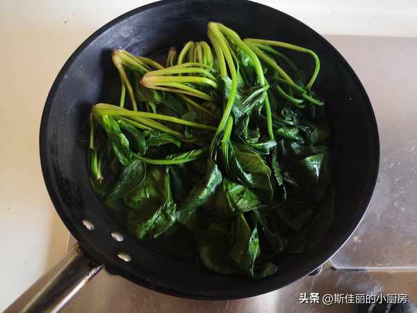 制作:燒鍋水 加入點鹽和幾滴油,將洗凈的菠菜放進鍋中焯燙變色後撈出備用, 這是因為菠菜含有草酸, 進入體內後會影響鈣的吸收, 因此烹飪菠菜之前要提前焯水去除部分草酸;