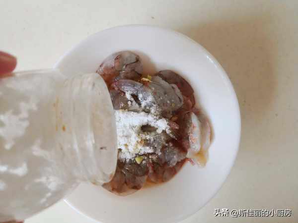 制作:1. 鮮大蝦去殼後挑出蝦線, 處理好的蝦仁加入少許鹽、料酒、淀粉和薑末等調味料拌均勻;