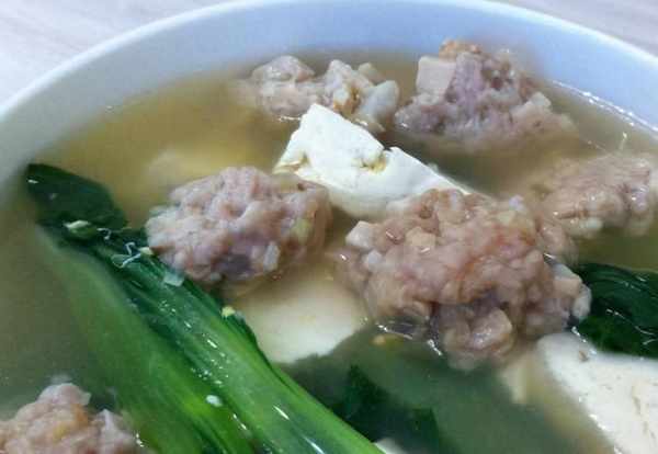 材料:青菜、豆腐、肉丸、水、鹽、香油;