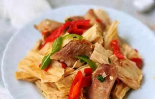 1、提前把五花肉煮八成熟切片,腐竹用清水浸泡軟切段,幹香菇泡發洗凈切片、蒜頭切片、小辣椒切段備用。