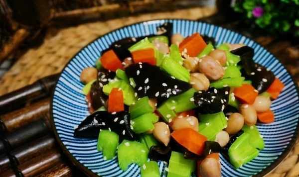 材料:芹菜1顆,胡蘿卜1根,水發黑木耳適量,花生豆2把,大料1粒,鹽3克,生抽1勺,白糖1勺,陳醋2勺,香油少許,白芝麻少許