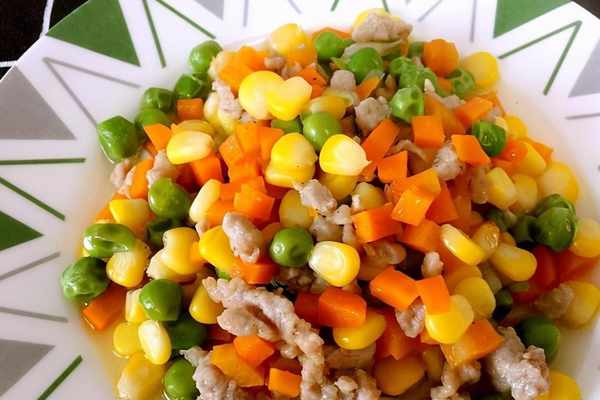 食材:豌豆一小碗、胡蘿卜半根、玉米一個、肉餡適量、醬油、鹽、大蒜末