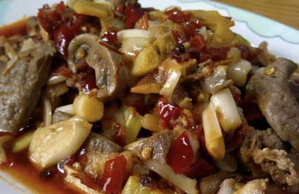 材料:羊心,羊肝,羊肺各100克,泡椒30克。豆瓣醬,薑片各10克,白糖,水淀粉各5克,鹽5克,雞精少許。
