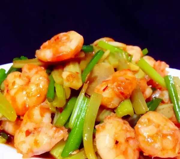 6.重起凈鍋,入底油,下泡椒煸出紅油,下薑蒜末炒香,下魚香汁、少量水炒勻,倒入蝦仁、蔥花炒勻即可。
