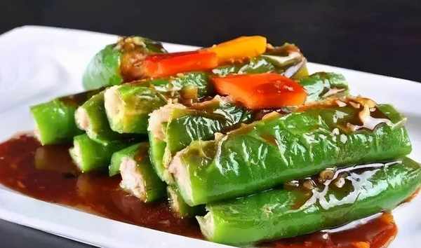 食材:嫩羊角青椒24隻,豬脊肉100克,豬肥膘肉25克,漿蝦仁50克,精鹽1克、味精1.5克、醬油10克、醋10克、紹酒10克、白糖10隻、蛋清1個,蔥白末5克、薑汁水10克、幹淀粉25克、濕淀粉5克、芝麻油10克、熟豬油40克