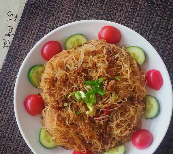 材料:綠豆粉絲2把、肉末適量、蒜苗2根、豆瓣醬1勺、老幹媽辣醬半勺、醬油1勺、胡椒粉適量;
