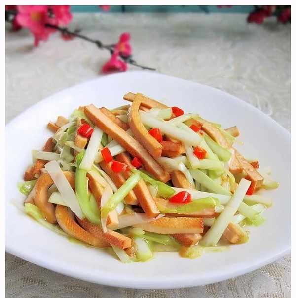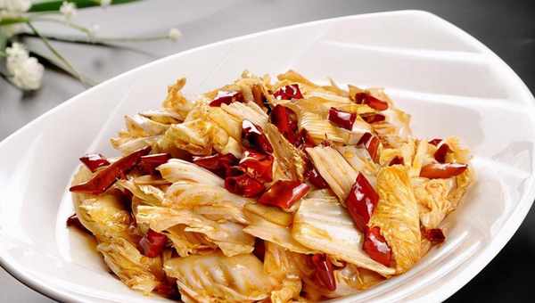 材料:白菜1個,醋10克,醬油5克,白糖3克,鹽1克,雞肉1克,幹紅辣椒4個,大蒜5瓣,食用油15克。