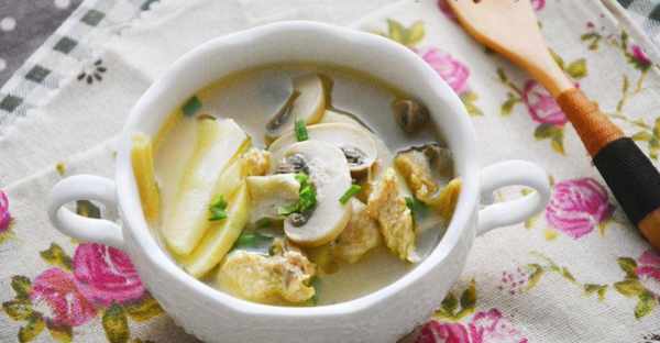 3、倒入開水,同時下入冬筍片,大火煮開轉小火煮1分鐘,然後下入蘑菇,煮開,小火繼續煮3分鐘。