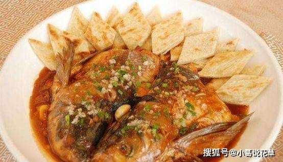 3、將醃制好的魚頭撈出蔥薑圈,均勻撒上面粉,鍋中倒入基礎油,將魚頭煎至兩面金黃,加入花椒、蒜、蔥、薑、幹辣椒、香葉,兩勺料酒,倒兩勺生抽,一勺紅燒醬油,半塊豆腐,一勺味噌,白糖,一罐啤酒,如果沒有啤酒。蓋上魚頭,加少許水將魚頭燒開,加鹽,小火煮25分鐘