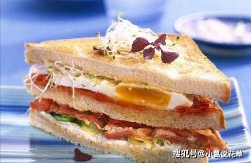 4.放入火腿片、煎雞蛋、生菜葉、西紅柿片、黃瓜片,蓋上第二片面包,切成三角形。