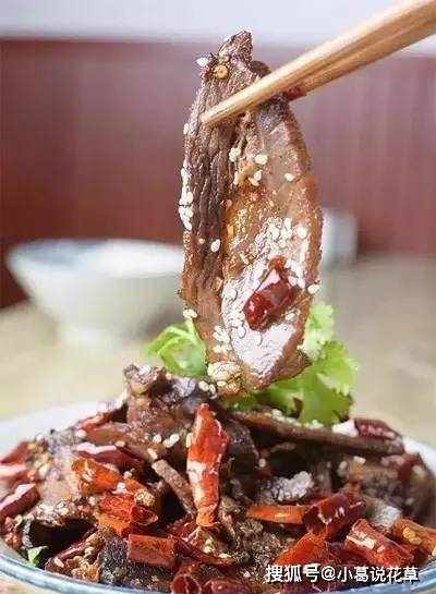 3.幹凈的鍋裡放植物油,燒熱至40%,然後加入幹辣椒粒、幹花椒、太和豆豉和辣椒面炒香,加入牛肉片不斷翻炒均勻,然後倒入適量的熟牛肉。高湯和一勺酒釀在鍋中炒至湯收幹,加入五香粉撒上白芝麻,起鍋放在鋪有筍絲的盤子裡,撒上香菜葉即可食用。