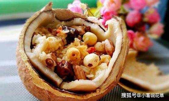 7.將椰子蓋上蓋子,放入碗中,用高壓鍋燉40分鐘。過濾後,放入玻璃杯中靜置20分鐘,取出